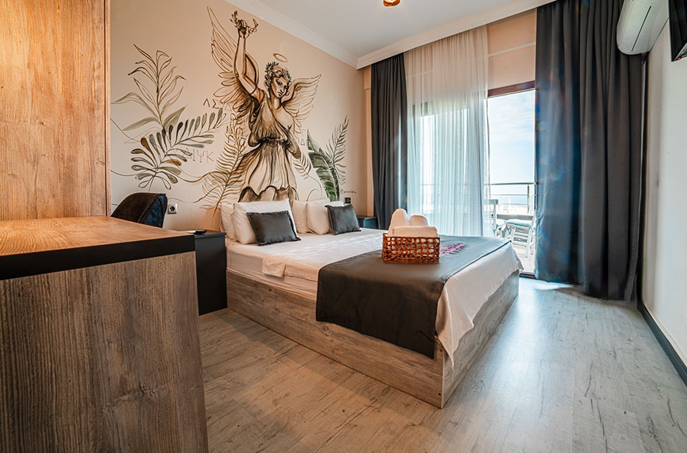 Bahçe ve Deniz Manzarası: Bahçeye ve Akdeniz'in büyüleyici deniz manzarasına sahip odalar, doğanın huzurunu ve sakinliğini bir arada sunar.