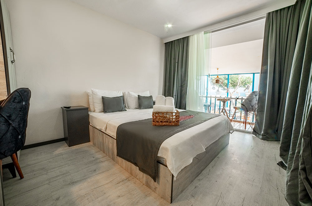 Bahçe ve Deniz Manzarası: Akdeniz'in büyüleyici manzarasına açılan pencereler, konforlu bir konaklamanın yanı sıra huzur verici bir atmosfer sunar.